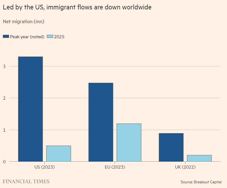 文章指出,全球多地正在经历“移民骤降”,其经济影响将在2026年更明显地释放。数据显示,2023年创下峰值后,美国净移民在2025年大幅下降;欧盟、英国同样出现显著回落,加拿大与澳大利亚也明显收紧移民与国际学生政策。作者认为,移民减少会直接压缩劳动力供给,使工会与劳动力谈判能力增强,并推升工资成本,从而在AI带来的就业焦虑背景下形成反向压力——即劳动力更稀缺、工资更强硬、通胀更顽固。文章警告,这一变量容易被市场低估,却可能成为通胀在2026年难以下行的重要原因之一。