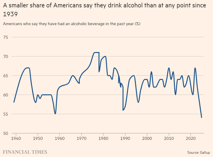 文章最后提出一个看似“非主流”但长期影响深远的趋势:全球饮酒比例下降。美国自1939年以来饮酒比例降至最低水平,英国也创下新低,多个发达与新兴国家出现类似变化。作者认为,饮酒下降部分来自健康意识提升,也与年轻一代消费偏好改变有关,同时在部分地区还存在替代性消费品的影响。趋势的结果是酒类企业长期承压,相关股票在过去数年落后于全球股市,并且下行速度可能在2026年进一步加快。文章认为,这一变化不仅是生活方式转变,也意味着消费品行业结构正在发生新一轮重估。