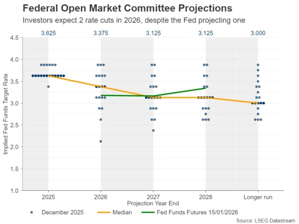 从衍生品定价看,联邦基金利率期货显示,投资者目前预期到2026年底累计降息约54个基点,意味着两次25个基点降息已被市场“完全计价”。但这与美联储最新点阵图所指向的“仅一次降息”存在明显差距。