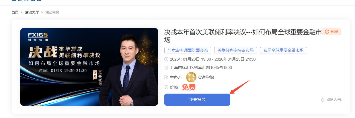 好消息来了!本周五(1月23日),宽客老师将携专业洞察空降徐家汇,开启一场干货满满的线下分享活动。作为深耕金融市场多年的实战派专家,宽客老师将聚焦本次美联储利率决议的核心动向,抽丝剥茧解析政策背后的逻辑与信号。