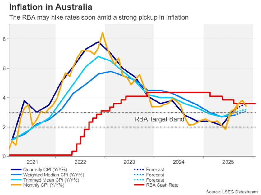 澳洲方面,市场对澳洲央行2月3日加息25个基点的概率已升至约58%。下周公布的CPI数据将是关键参考。季度数据预计略高于上一季度,月度数据10月为3.8%同比,11月回落至3.4%。若CPI高于预期,澳元/美元可能继续上攻至0.6900附近;若低于预期,则可能承压。