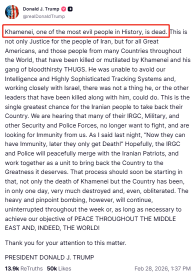 “哈梅内伊——历史上最邪恶的人之一——已经死了。”特朗普周六下午在Truth Social上发文称。他表示,这一结果是对那些被这位最高领袖及其“打手”杀害的伊朗人和美国人的“正义”。